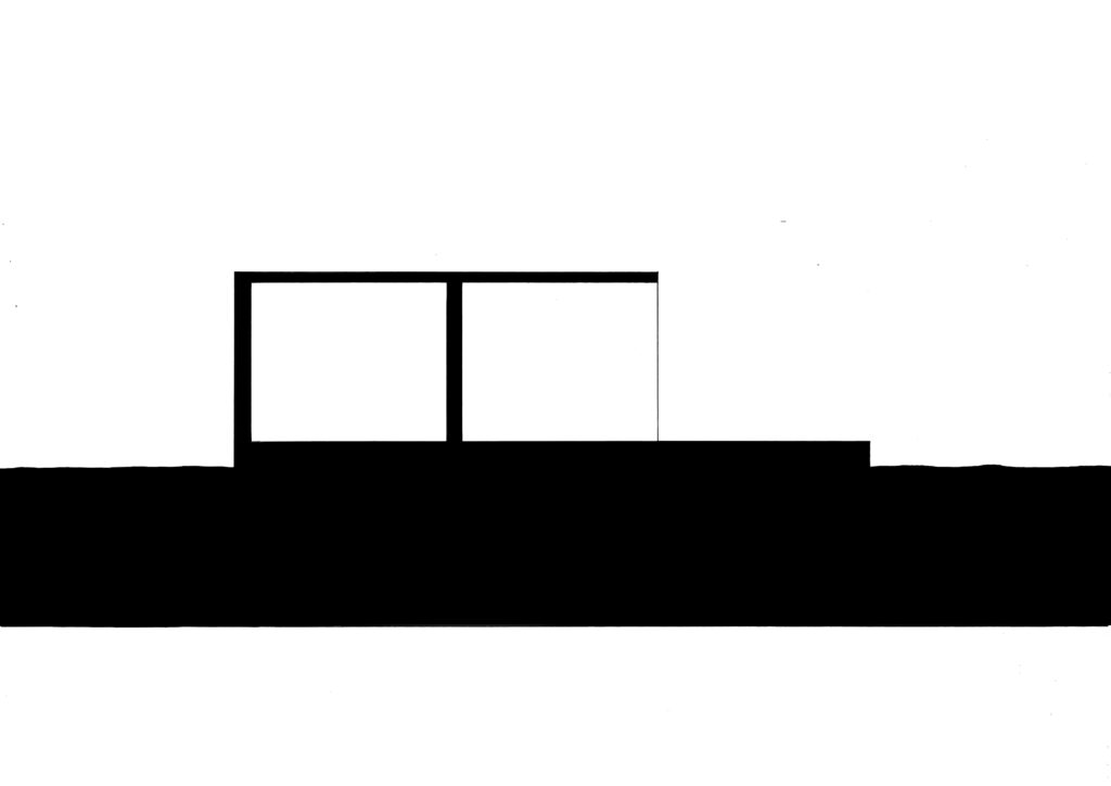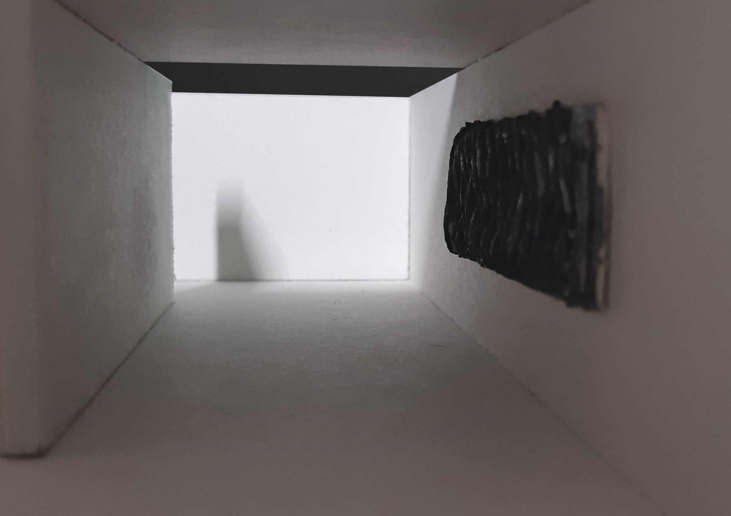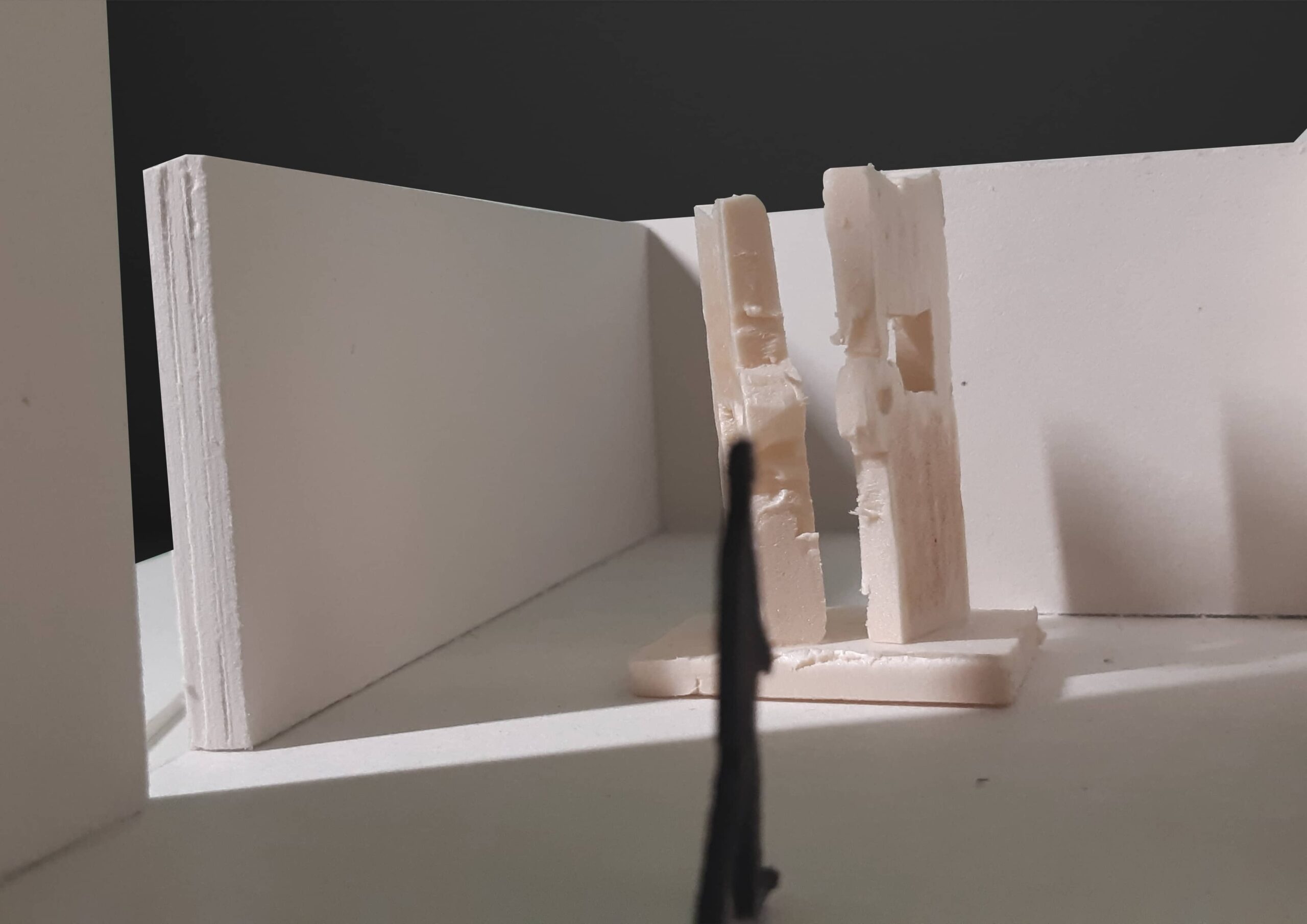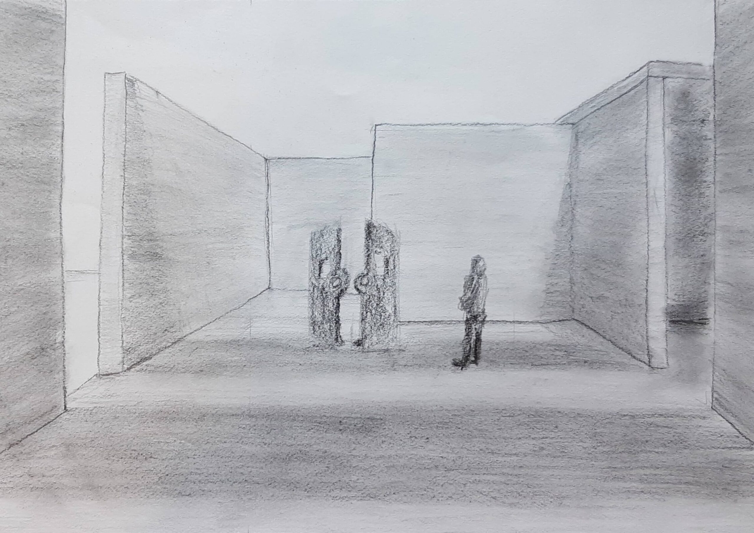Le voyage se termine sur une dernière sculpture de Chillida (Monumento). Les oeuvres de Chillida étant souvent conçues pour être placées en extérieur, j’ai décidé de placer une oeuvre visible tant à l’intérieur qu’à l’extérieur du lieu d’exposition. La toiture vient offrir un cadrage à la fois sur la sculpture et sur le paysage, harmonisant ainsi ces deux éléments. (Dessin et photo n°3)