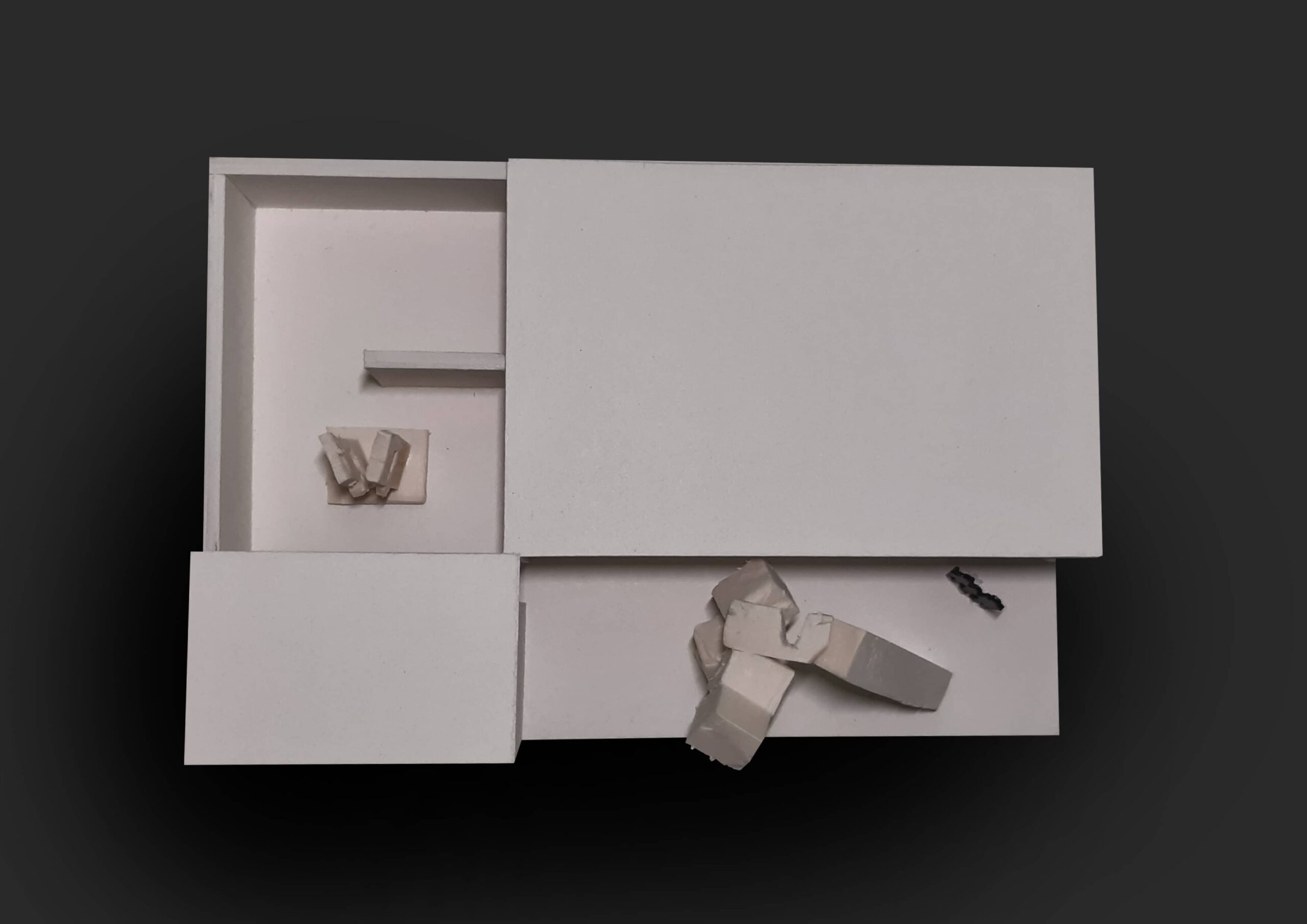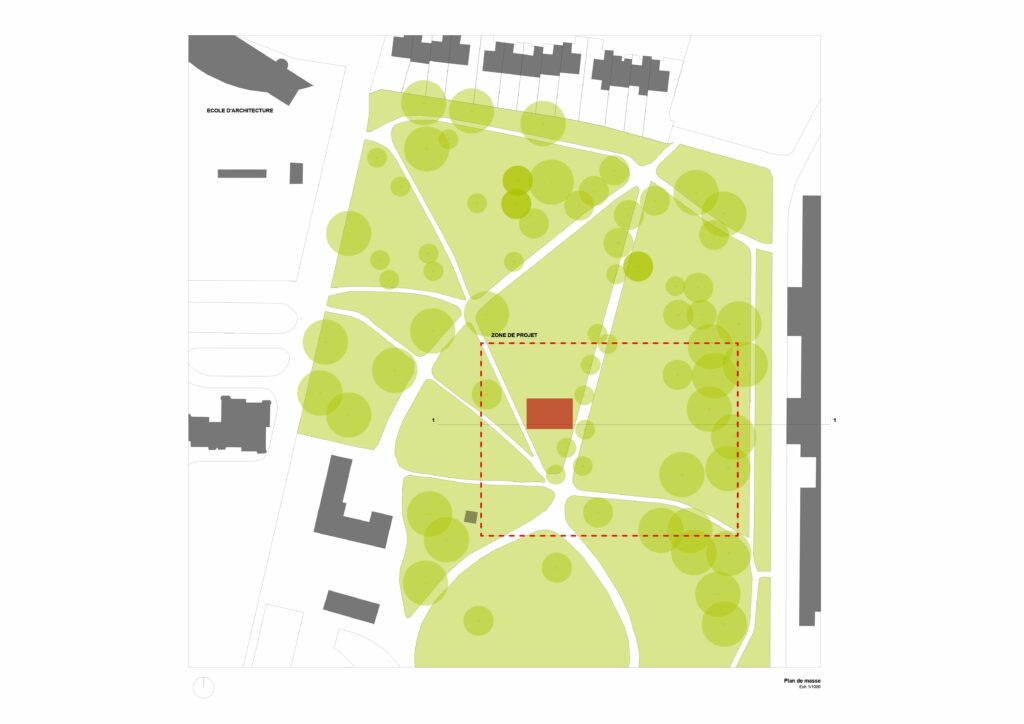 Pour ce projet, j’ai décidé de réutiliser les proportions de la parcelle et de créer une grille à partir de celles-ci, sur lesquelles sont disposés les différents éléments. Les trois espaces formés par cette grille ont chacun leur caractéristiques en fonction des œuvres exposées au fil du parcours.
