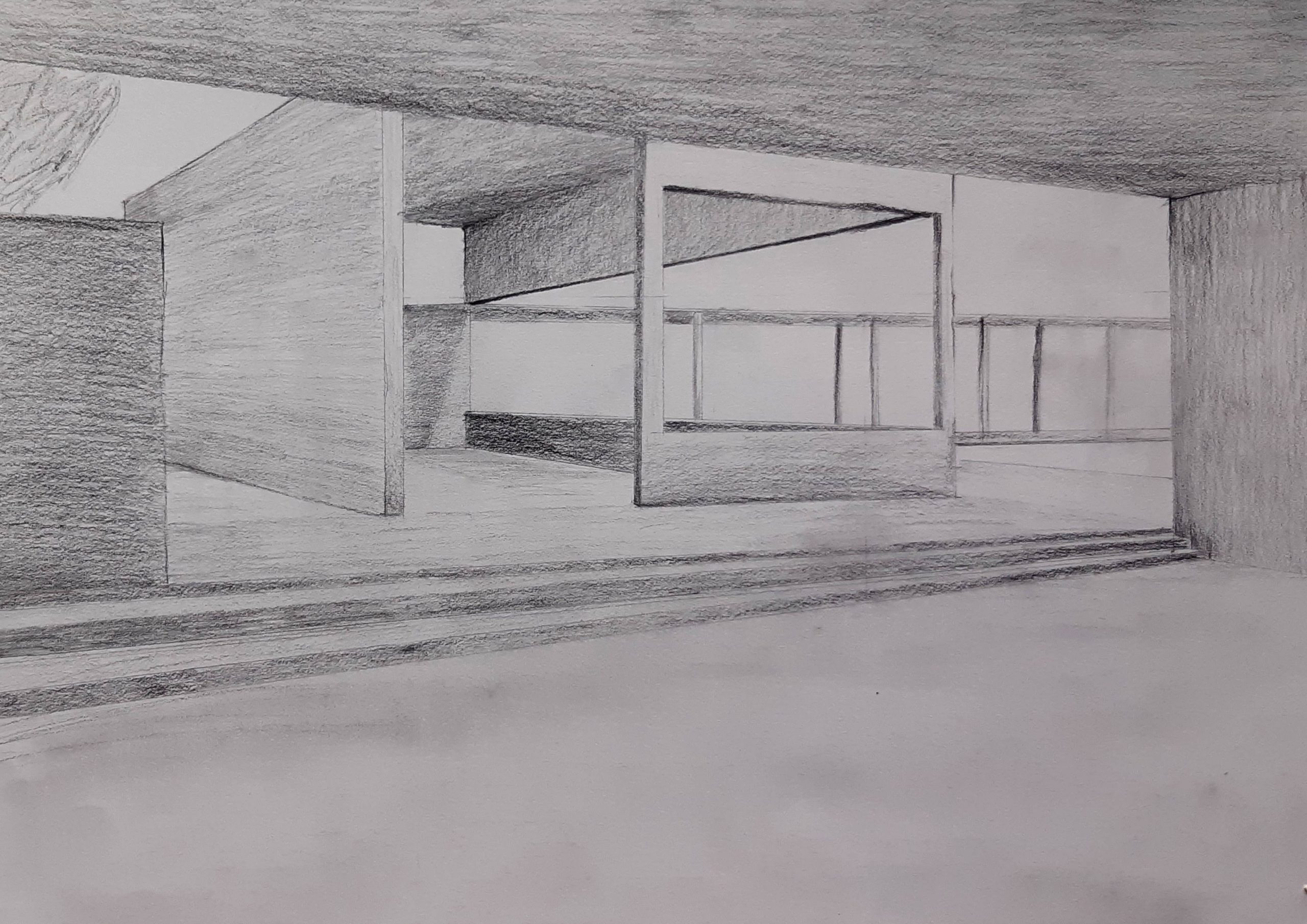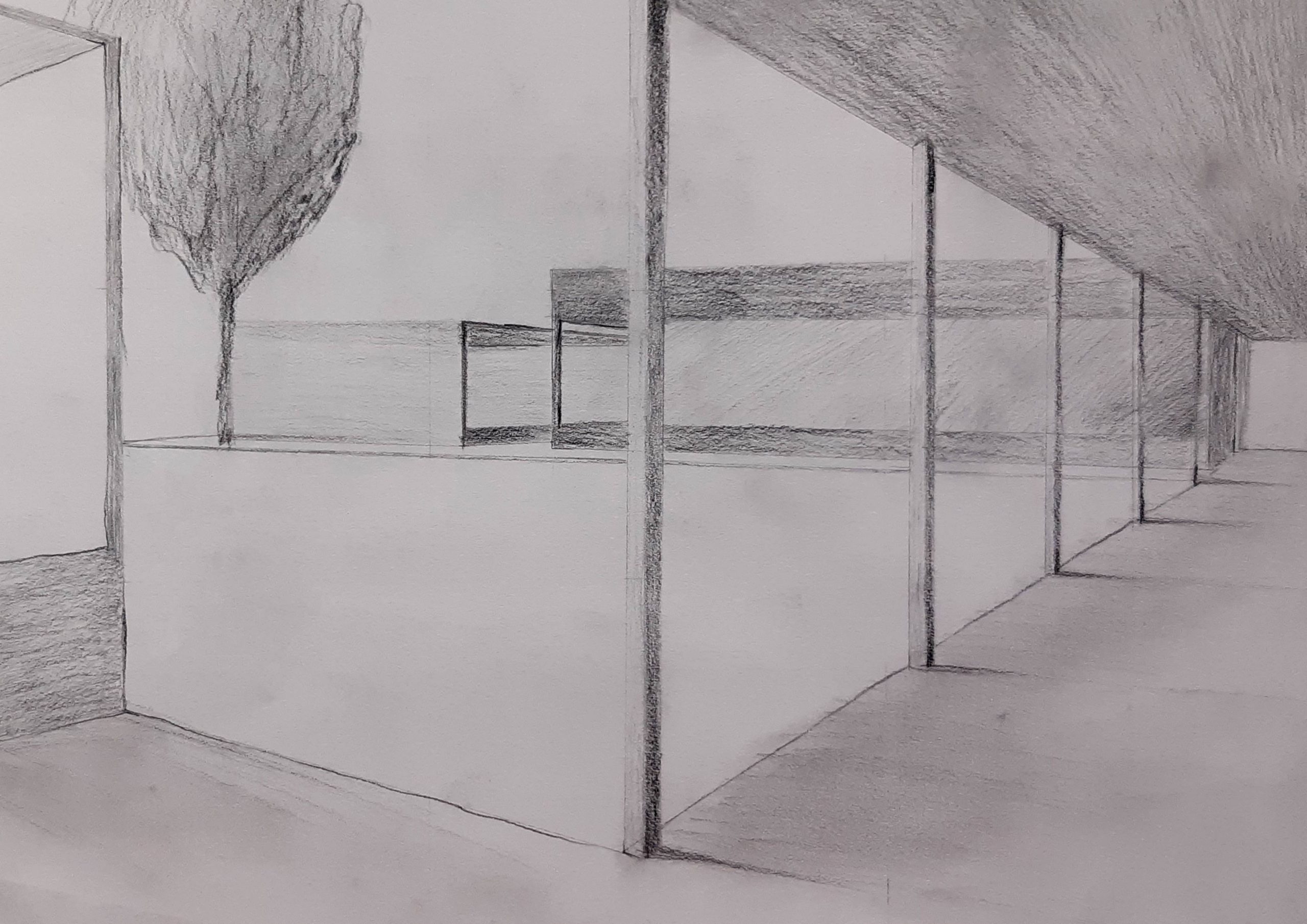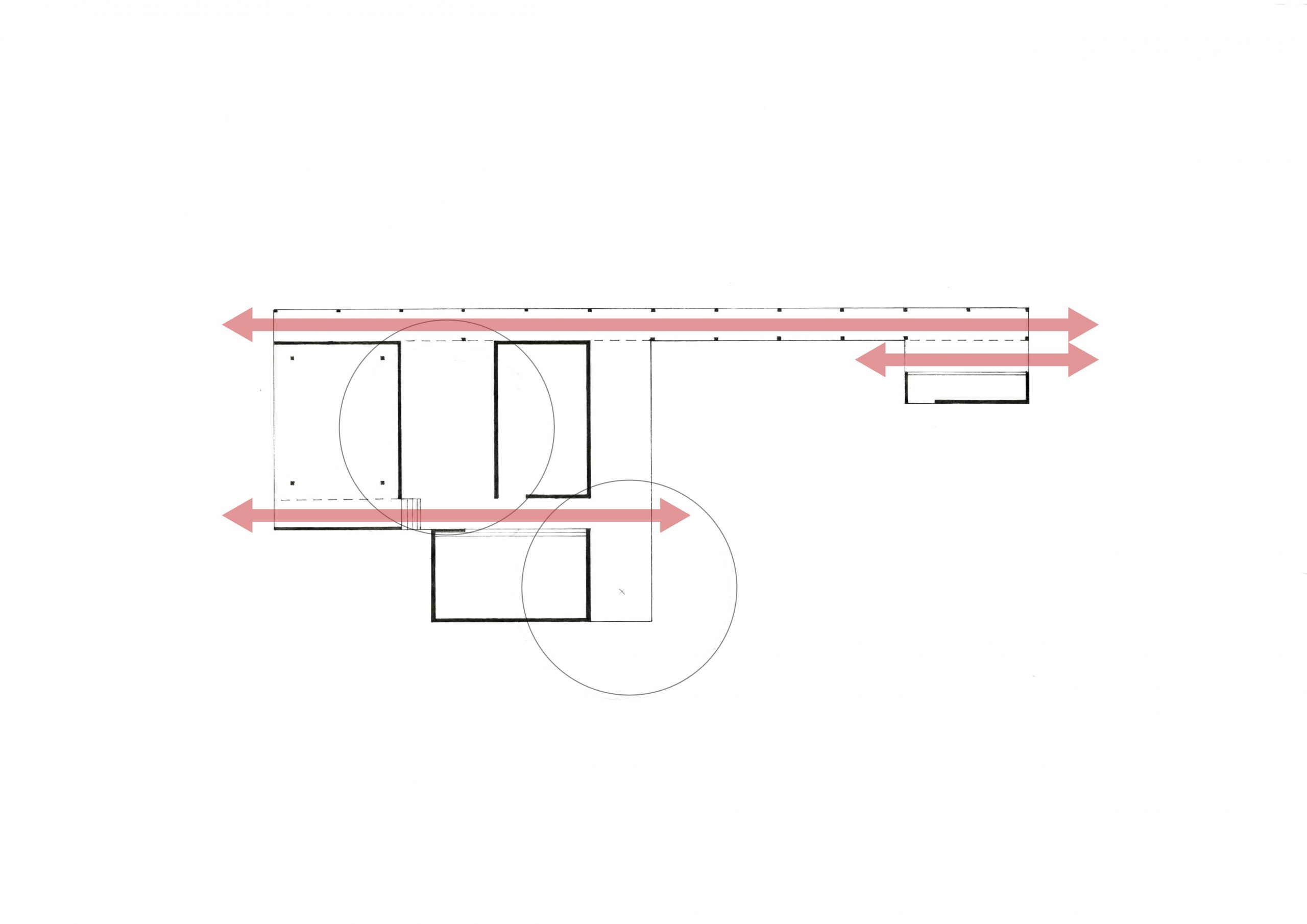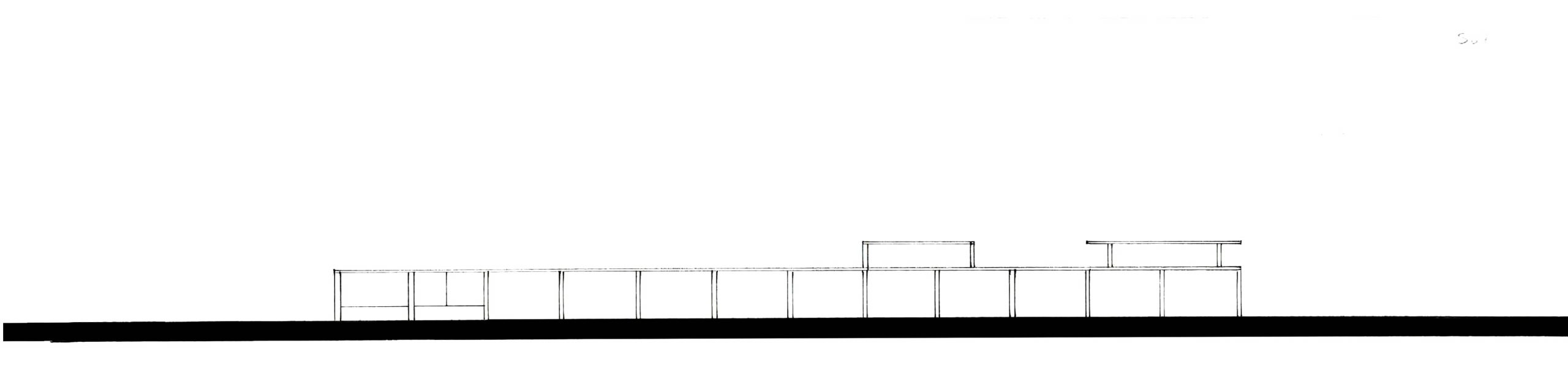 Pour finir, le projet répète des proportions et utilise des hauteurs régulières (seulement deux hauteurs différentes). De plus, le projet est guidé et aéré par des axes le traversant et insistant sur son aspect horizontal. Parmi ces axes, le plus important est celui qui dirige la colonnade.