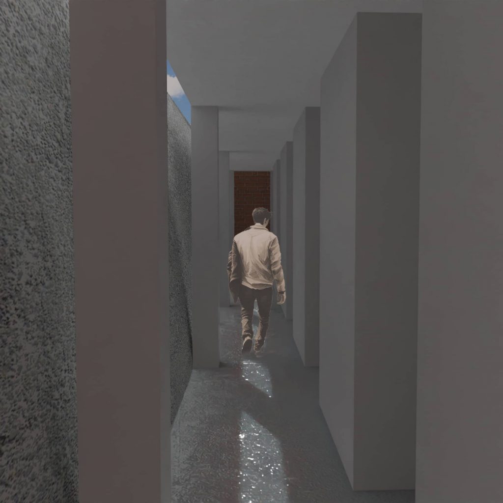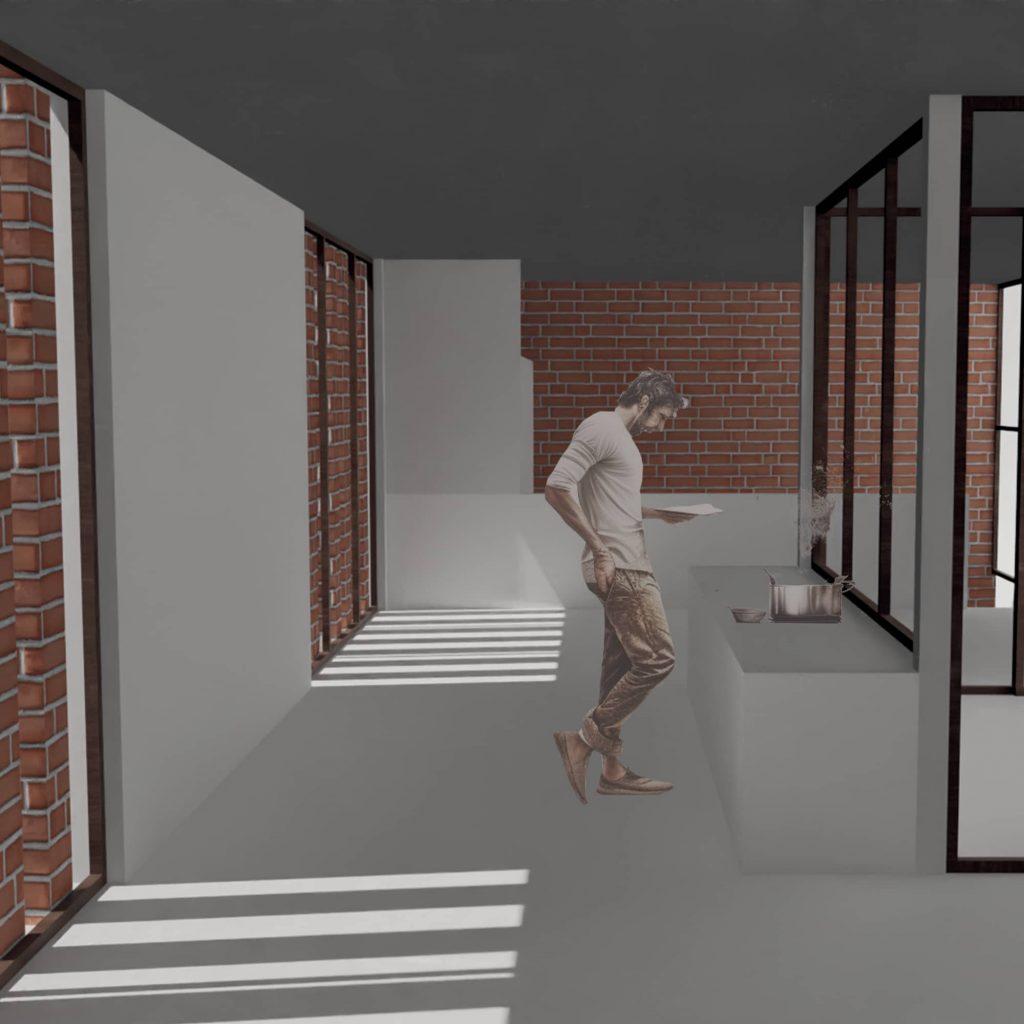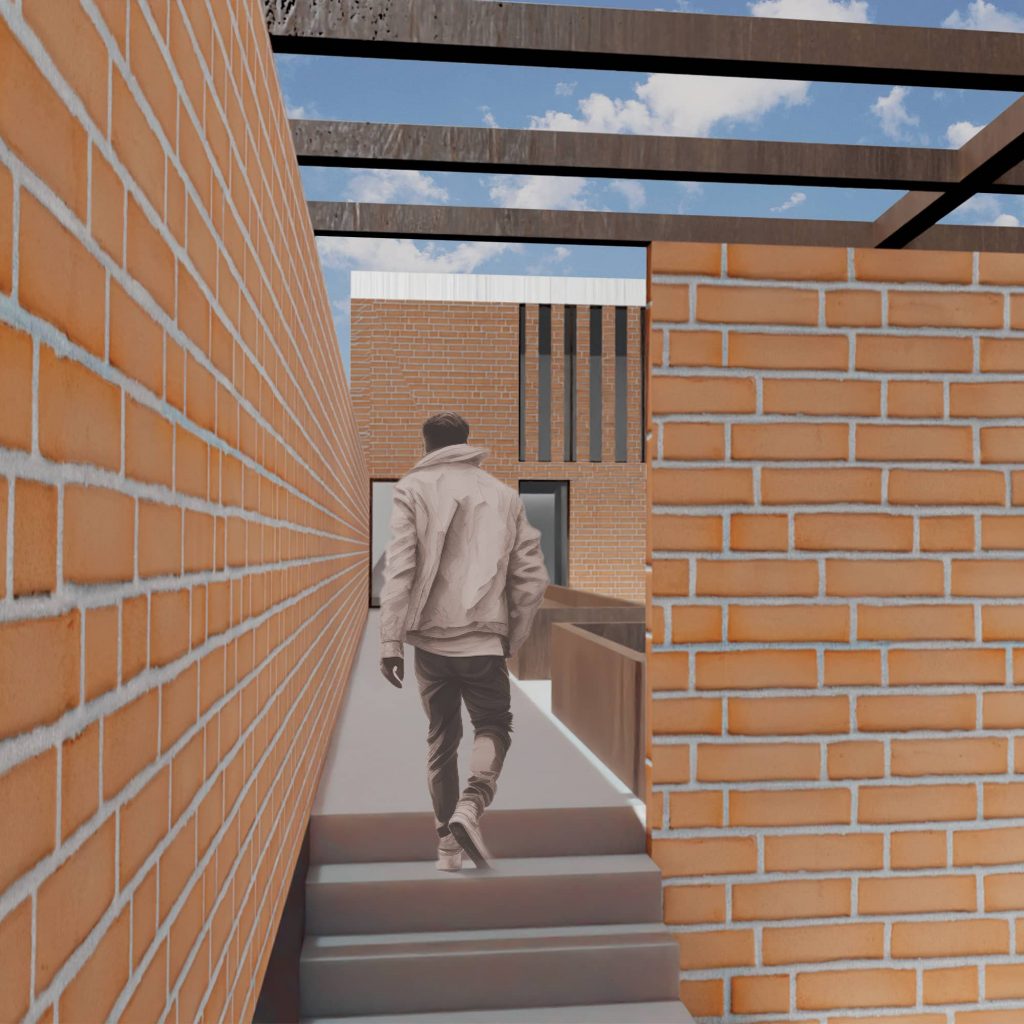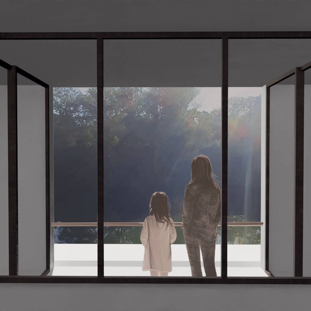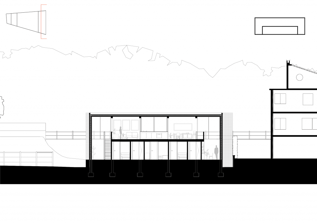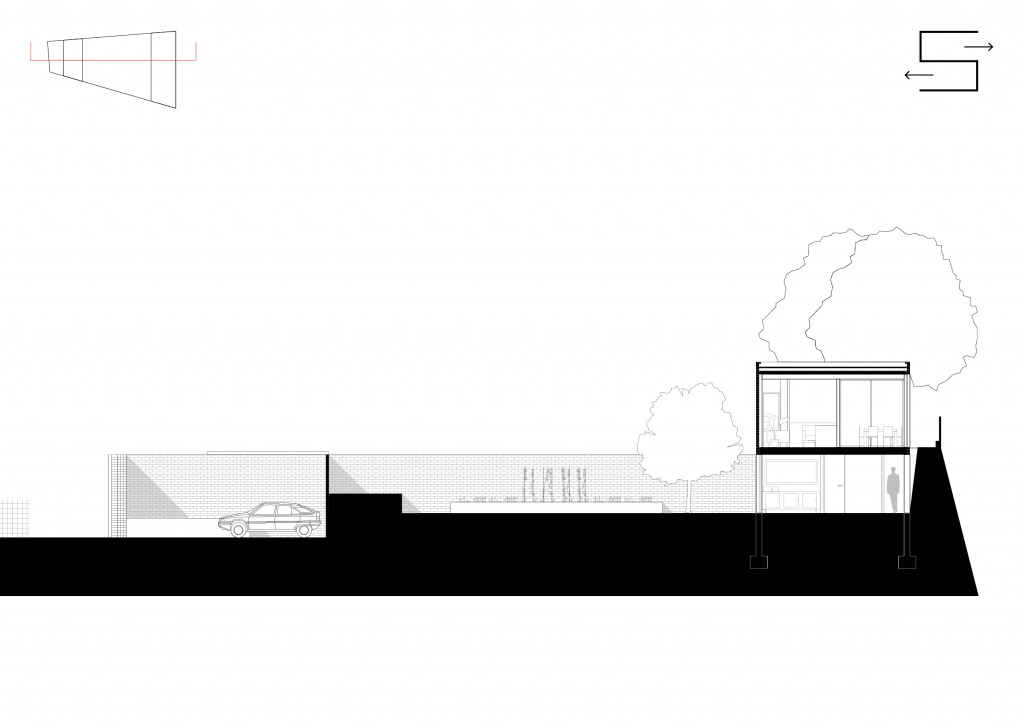 Ensuite, à partir du programme nous avons fait le choix de créer une dualité entre une partie commune et une partie intime. La partie commune rassemble le salon, la cuisine est la terrasse en un seul organe, tandis que la partie intime est composée de nombreuses pièces mineures. Ensuite, nous avons distingué deux extérieurs : l’extérieur de la parcelle et du jardin, et l’extérieur du paysage et la Garonne. Nous avons fait le choix d’associer le RDC, l’étage de l’intime à l’extérieur de la parcelle; et le R+1, l’étage de la vie commune au paysage. Nous avons ensuite mis en place deux espaces de connexion entre les deux étages. Ces deux espaces jouent un rôle majeur dans le projet.