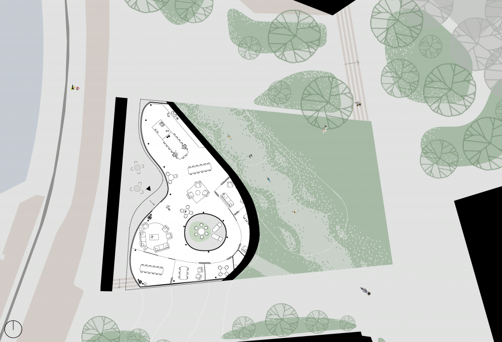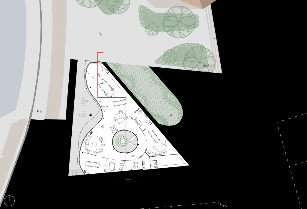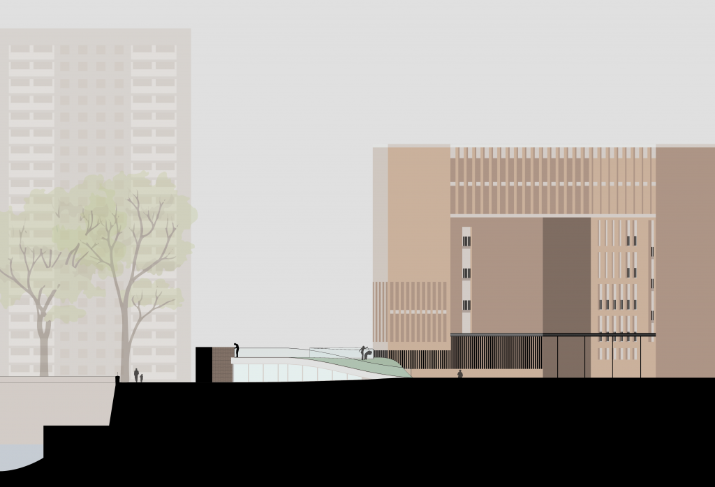 Parti pris : Dans un site aujourd’hui colonisé par les parkings, nous avons décidé de rendre l’intégralité de la place aux piétons. Et ainsi, nous avons placé notre bâtiment sous le sol de la place. Cela permettait aussi de mettre en valeur des fragments d’histoire aujourd’hui délaissés. Le projet paysager prend autant d’importance que le projet architectural. Nous proposons de modeler le terrain afin de glisser subtilement le tiers-lieu sous un terrain en forme de “vague”.