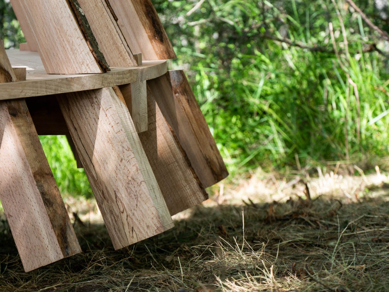 Comment respecter le matériau qu’est le bois ? Nous nous sommes fixés un défi : concevoir notre projet à partir d’une grume (un tronc) de hêtre et réaliser l’intégralité de nos découpes à l’intérieur de celle-ci afin de valoriser l’intégralité du bois et éviter les chutes. Les parties externes du tronc (l’écorce, le liber, le cambium et l’aubier) viennent former l’enveloppe, tandis que les couches internes de la grume (le duramen) sont les plus résistantes et forment l’ossature et le plancher.
