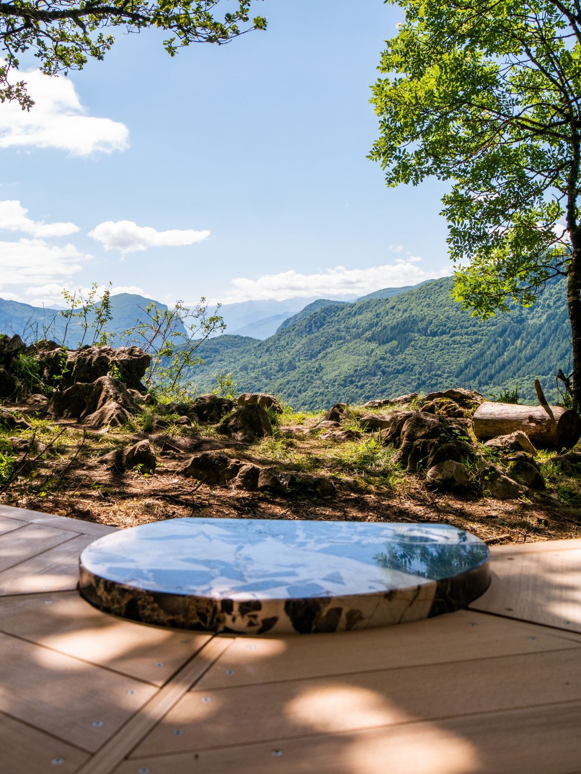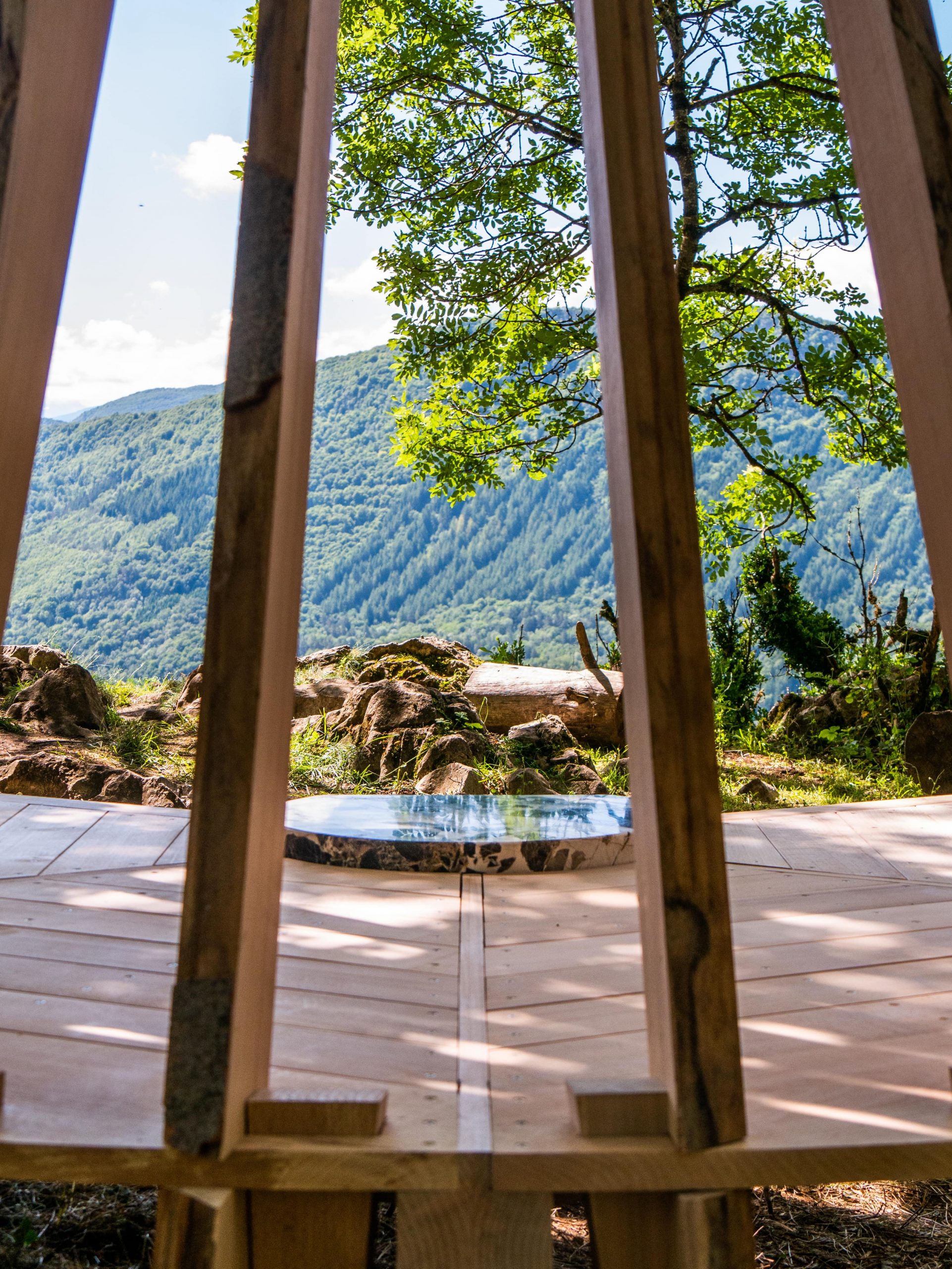Enfin, en plein cœur de la structure, deux pièces se distinguent des autres par leur unicité : la couronne haute et la pierre centrale. La première instaure un dialogue avec la canopée et le ciel, tout en étant le point de convergence de l’ensemble des montants verticaux. La seconde est une pierre de Grand Antique, un marbre ariégeois, qui ancre le projet dans son territoire minéral, du village de Rabat-les-trois-seigneurs à la falaise qui sous plombe le rocher en passant par les vestiges d’un château cathare à quelques centaines de mètres. Cette dernière pièce est à la convergence des planchers et instaure un rapport au sol. Je tiens à remercier les artisans de la marbrerie Debezy pour leur générosité et leur aide précieuse dans la réalisation de cette pièce complexe.