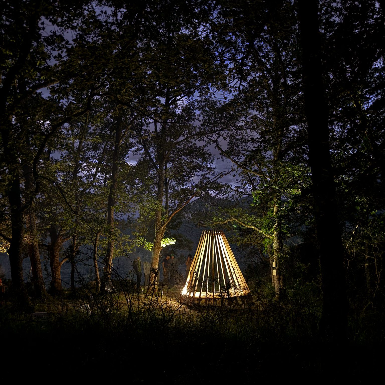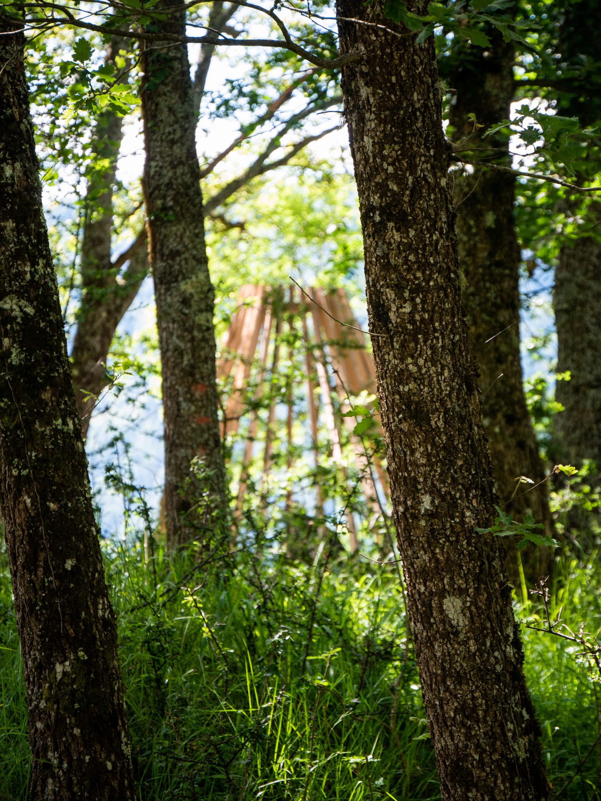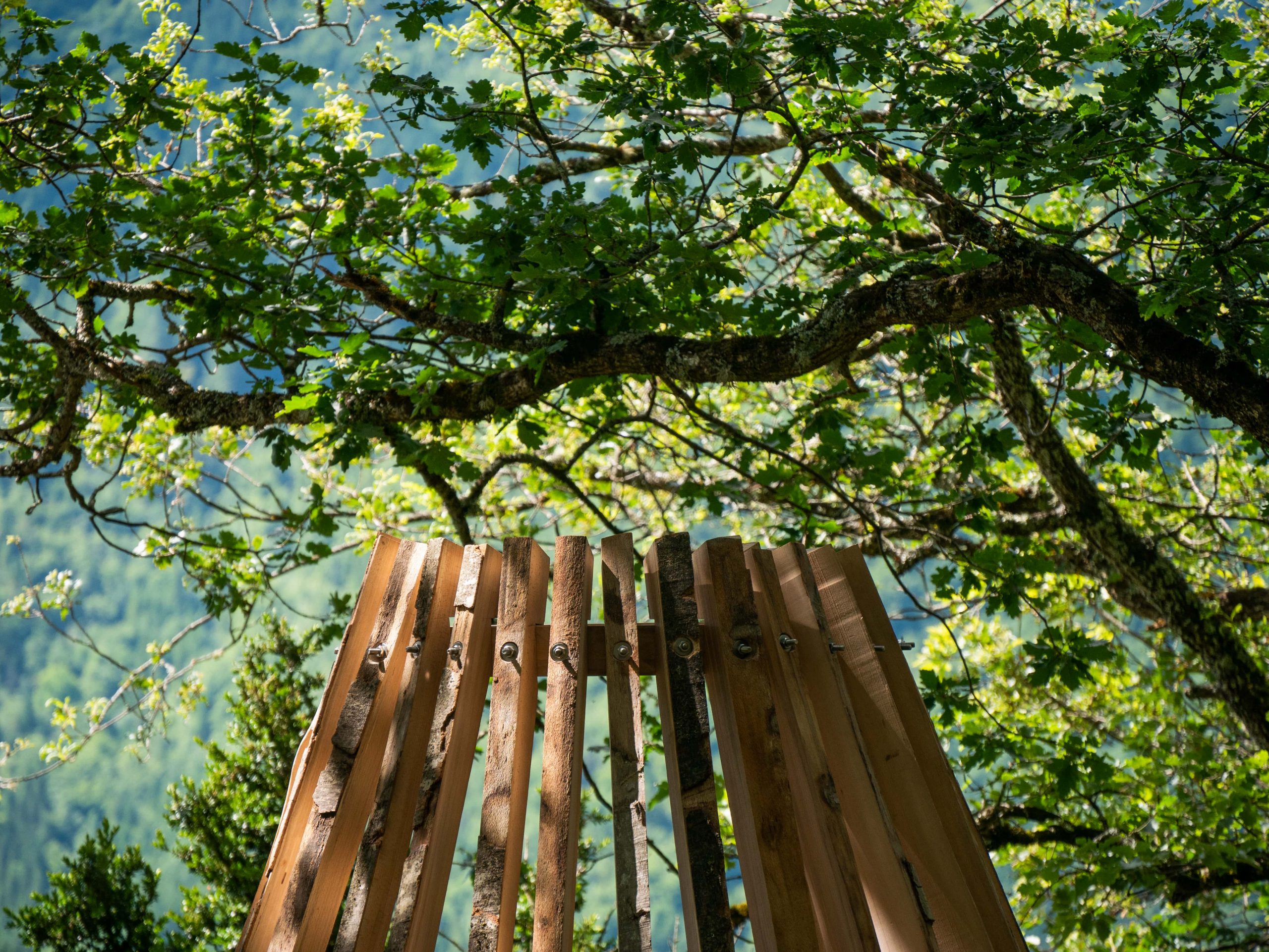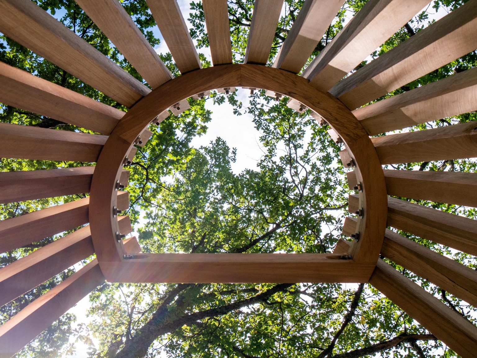 Cette réponse structurelle se traduit par une réponse visuelle : sur la partie externe, la structure montre l’écorce, fait le dos rond et tente de se camoufler dans la foret tandis qu’en son cœur, il accueille chaleureusement, à bras ouvert en montrant son bois doux et lisse.