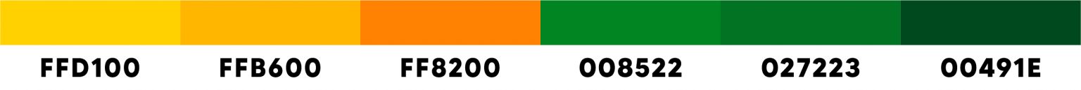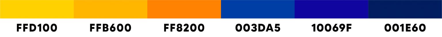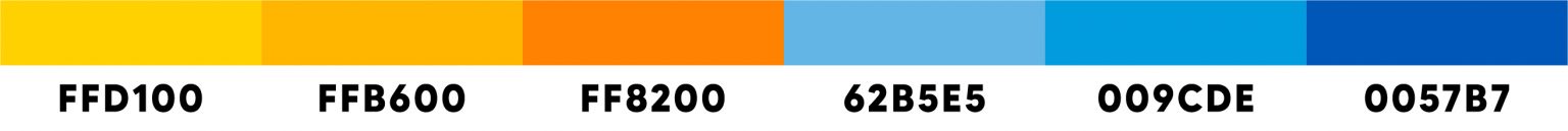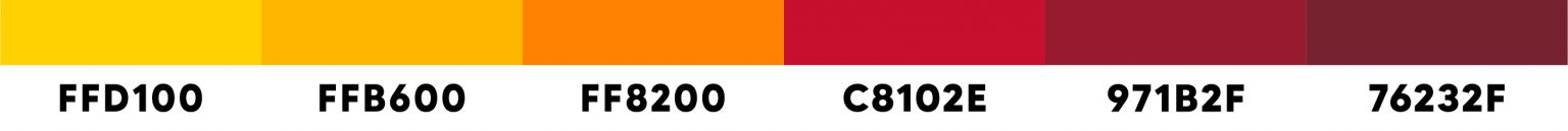 Différentes palettes de couleur sont utilisables pour représenter l’identité de Pyreneo. Chaque palette doit être composée de 3 nuances de jaune et de 3 nuance d’une autre couleur. Toutefois, il est préférable d’associer la palette jaune avec du noir ou du blanc.
